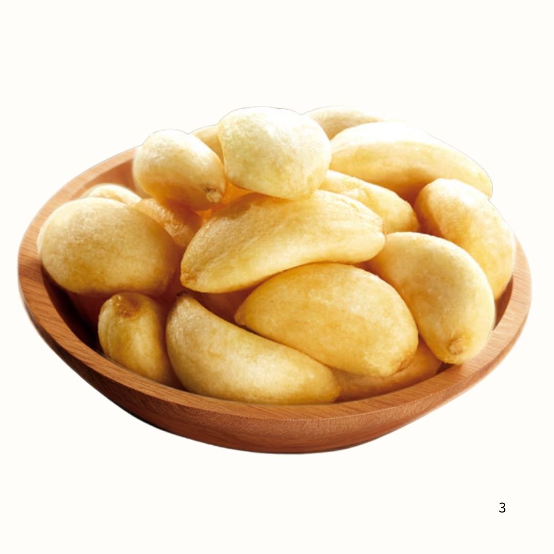 【菓茶小鋪】選用台灣在地蒜頭,透過專業工法低溫烘焙,讓每一粒蒜頭都維持完整外型,並呈現迷人的金黃光澤。我們悉心掌握製程,讓蒜粒保留了鮮甜蒜香,口感紮實且酥脆不油膩。不論是直接作為日常零嘴、好友小聚時的下酒配點,或是捏碎後灑於料理上提味,都能帶來豐富的味覺饗宴。