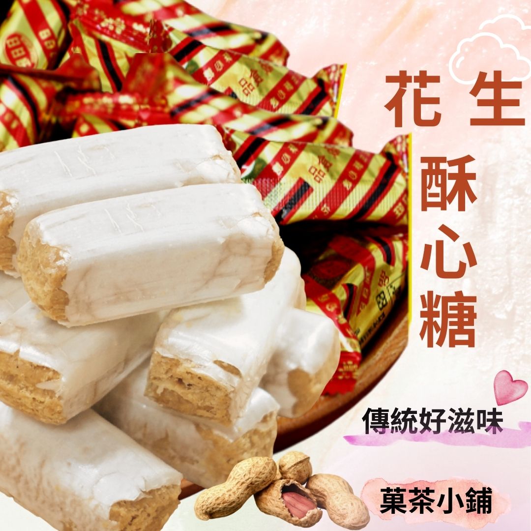 【菓茶小鋪】的酥心糖,是台灣經典懷舊零食的代表。我們堅持使用傳統工法,嚴選優質花生,細磨成綿密內餡,搭配適中甜度的外皮。每一口都能感受到酥、香、甜三種層次,尤其它入口即化的獨特口感,讓長輩和小孩都能輕鬆享用,是您品嚐古早味的最佳選擇。